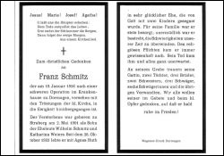 Tod nach Operation; Eltern: Wilhelm Schmitz u. Katharina geb. Weiers; ∞ 28.10.1933 Agnes Huth; 2 K.; Druck in Dormagen |