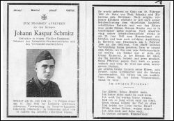 Gefallener 2. Weltkrieg; Eltern: Paul Schmitz u. Hubertine geb. Breitmar; im landwirtschaftl. Betrieb der Eltern tätig; nach RAD am 23.6.1943 zum Heer, zuerst in Dänemark, dann am 2.2.1944 an die Ostfront; am 18.7.1944 b. Lemberg schwer verwundet; er starb an den Folgen dieser Verwundung |