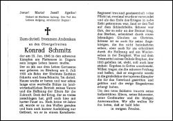 Gefallener 2. Weltkrieg; Eltern: Zachäus Schmitz u. Anna Schmitz; arbeite im landwirtschaftlichen Betrieb des Vaters; 1923 Einberufung, als er noch keine 19 J. alt war; nach kurzer Ausbildung an die Ostfront; Onkel Stephan im 1. Weltkrieg gefallen |