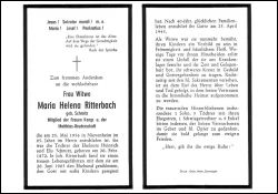 Mitgl. Frauenkongregation u. Matthias-Bruderschaft; Eltern: Ehel. Heinrich u. Elisabeth Schmitz; ∞ 20.6.1903 Johann Ritterbach, † 25.4.1943; 6 K.; Unfall wenige Tage vor ihrem Tod; seitdem Krankenlager; Druck in Dormagen |