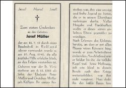 Gefallener 2. Weltkrieg; 12.7.1943 schwer verwundet; Eltern: Peter Müller u. Gretchen geb. Köllgen; Elektroberuf; Druck in Köln-Nippes |