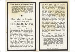 Eltern: Engelbert Hütten u. Katharina geb. Schnitzler; ∞ 22.10.1911 Philipp Kraus; 6 K., davon 1 mit 2 1/2 J. †; Sohn Jean b. Stalingrad vermisst; wiederholte Krankheit; Druck in Lechenich |