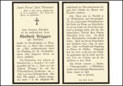 ∞ 15.6.1907 Johann Brüggen, am 2.7.1916 im 1. Weltkrieg in Frankreich gefallen; 3 K., davon 1 in der Genossenschaft der Vincentinerinnen; körperliche u. seelische Leiden; Druck in Bedburg/Erft |