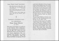 ∞ 23.5.1901 Josef Erkens; 9 K., davon 3 jugendl. †; 1 Sohn im 2. Weltkrieg gefallen; 1 erwachsene Tochter einige Jahre nach dem Krieg †; 1961 Diamantene Hochzeit; ältester Sohn 1954 zum Priester geweiht |