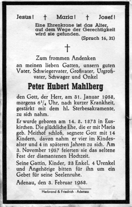 ∞ 1897 Maria Meithof; 14 Kinder, davon 8 †; 1957 Diamantene Hochzeit; Wohnort: Adenau |