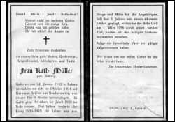 ∞ Okt. 1904 Hermann Müller aus Neschermühle, † 1928; 8 K., davon 3 Söhne im 2. Weltkrieg gefallen; seit fast 8 J. schweres Leiden; Druck in Asbach |