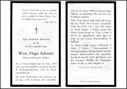 ∞ 31.1.1906 Johann Hugo Schmitz, † 1.7.1931; 8 K., davon 3 jugendl. †, 1 Sohn im 2. Weltkrieg in Russland gefallen; Druch in Bergisch-Gladbach |