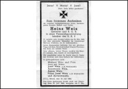 Gefallener 2. Weltkrieg; 21 J.; Heldenfriedhof Castel Porziano b. Rom; Eltern: Michael Weis u. Anna geb. Weber; Wohnort: Zell, Mosel |