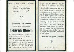 Eltern: Johann Ohrem und Magdalene Giesen; ∞ 21.2.1941 Angela Clemens aus Brüggen; 1944 Gefangenschaft, Opfer 2. Weltkrieg |