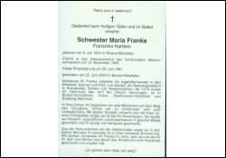Jugendschwqester, Seelsorgehelferin, Oberin;10.11.1952 Eintritt Schönstätter Marienschwestern; 20.7.1961 ewige Eingliederung |