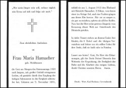 ∞ 1.8.1913 Heinrich Hamacher; 3 Söhne (davon 1 im 2. Weltkrieg gefallen) u. 1. Tochter (Druck in Grevenbroich) |