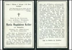 ∞ 24.6.1876 Josef Keller aus Lommersum † 28.8.1902 ; 11 K. davon 3 †; Mitgl. Mütterverein |