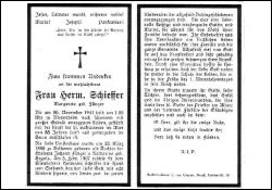Eltern: Johann Fünger u. Katharina geb. Engels; ∞ 3.2.1907 Hermann Schiefer, Eisenbahner; 8 K., davon 2 früh †; schweres Leiden |
