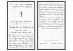 ∞ 6.11.1923 Peter Schreurs; 3 K.; langes Leiden; Mitgl. Frauen- u. Mütterverein; Druck in Brüggen, Ndrh. |
