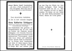 Jungfrau; Mitgl. Jungfrauenkongregation u. Immerwährender Kreuzweg; Eltern: Arnold Schöpgens u. Cornelia geb. Cleuvers; 20 J. im Haushalt des Pfarrers Trecker in Elmpt; Druck in Waldniel |