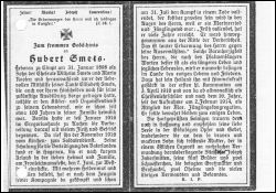 Gefallener 1. Weltkrieg; Eltern: Wilhelm Smets u. Maria geb. R∞sen; seine verstorbene Tante Elisabeth Smets sorgte vor ihrem Hinscheiden für seine Ausbildung: Küster u. Organist; dieser Beruf war seit 100 J. in der Familie heimisch; seit Jan. 1916 Ausbildung am Gregoriushaus in Aachen; Nov. 1916 Einberufung zum Militärdienst; am 7.6.1917 an die WestfrontStiefbruder Joseph Indersmitten verwundet in einem Lazarett im Osten |