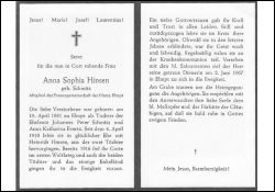 Eltern: Johannes Peter Schmitz u. Anna Katharina geb. Evertz; ∞ 4.4.1910 Heinrich Hinsen, 1916 im 1. Weltkrieg gefallen; 2 Töchter, beide †, ebenso das einzige Enkelkind †; in den letzten Jahren erblindet |