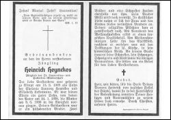 Tod nach Unglücksfall; Jüngling; Eltern: Laurenz Heynckes, † 24.1.1938, u. Elisabeth geb. Lafontaine, † 3.6.1936; 2 Brüder u. 1. Schwester bereits †; er nahm sich der Frau und des Kindes seines vermissten Bruders Wilhelm an; Druck in Brüggen |