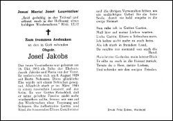 Gefallener 2. Weltkrieg; Eltern: Jacob Jakobs u. Maria geb. van der Vorst; ∞ 8.8.1939 Berta Nelessen; 1 Sohn; Kriegsgefangenschaft; Druck in Waldniel |