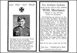 Gefallener 2. Weltkrieg; Eltern: Johann Mevissen u. Sofia geb. Günnen; 1939 zur Wehrmacht; Kriegseinsatz in Belgien, Frankreich, dann Russland; Druck in Bracht |
