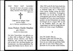 Eltern: Johann Mertens u. Sibylla Katharina geb. M∞ren; ∞ 1911 Peter Maaßen aus Steinkenrath, † 6.3.1929; 5 K., davon 2 Söhne im 2. Weltkrieg in Russland gefallen; |
