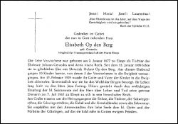 Mitgl. Frauengemeinschaft Elmpt; Eltern: Johann Geraedts u. Anna Maria geb. Reefs; ∞ 13.1.1899 Heinrich Hubert Op den Berg, † 15.2.1929; 10 K., davon 3 †; |