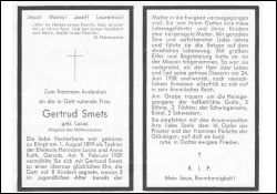 Mitgl. Mütterverein; Eltern: Hermann Lucas u. Anna Katharina Gerads; ∞ 9.2.1929 Gerhard Smets; 8 K., davon 3 jugendl. †; |