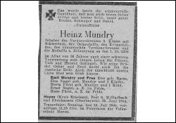 Gefallener 2. Weltkrieg; die Familie erhielt erst Gewissheit über seinen Tod am 25.6.1944; Eltern: Emil Mundry u. Else geb. Busse; Wohnort: Heyen, Kr. Erkelenz; 2 Brüder (Oskar u. Emil) ebenfalls im 2. Weltkrieg gefallen |