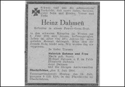 Gefallener 2. Weltkrieg; Eltern: Heinrich Dahmen u. Maria geb. Smets; Wohnort: Oberkrüchten |