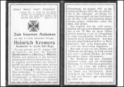 Gefallener 1. Weltkrieg; Eltern: Alex Kremers u. Maria geb. Müncks; 17.11.1916 Einberufung; Soldatenfriedhof Merly |