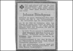 Todesanzeige in einer Zeitung; Gefallener 2. Weltkrieg; 22 J.; seine Brüder Josef u. Bernhard ebenfalls gefallen; Eltern: Josef Büschgens u. Gertrud geb. Rütten; verlobt mit Wilhelmine Schulz; Wohnort: Klinkum |