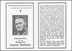Gefallener 2. Weltkrieg; Eltern: Wilhelm Maahsen u. Wilhelmine geb. Kamps; ∞ 4.5.1935 in Niederkrüchten Anna Wolfs; 2 K.seit 4.1.1942 auf Dauaer Soldat; nahm an "Bandenkämpfen" auf dem Balkan teil; russ. Kriegsgefangenschafdt in kaukasischem Lager |