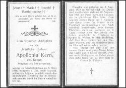 ∞ 19.9.1905 Peter Kern; 7 K., davon 1 †; sie starb 8 Tage nach der Geburt ihres 7. Kindes; Mitgl. Mütterverein |