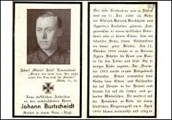 Gefallener 2. Weltkrieg; Eltern: Burtscheidt Heinrich und Zurheiden Appolona; Ehefrau: Schäfer Agnes, ∞ am 12.10.1925; Hochzeit in Horrem; Verletzt bei einem Fliegerangriff bei der Heimfahrt in Köln am 04.04.1944; dann verstorben im Lazarett in Düren am 30.04.1944 |