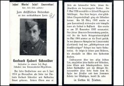 Gefallener 2. Weltkrieg; Eltern: Schneider Gerhard und Geuer Katharina; Geschwister: 7; Ehefrau: Schillinger Margarete, ∞ am 07.05.1938; Kinder: 1; 2 seiner Brüder sind bereits vor ihm im Osten gefallen |