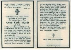 Langes, schmerzliches Dahinsiechen; Eltern: Ferdinand Hahn u. Anna Katharina geb. Lukas; ∞ 2.12.1893 in Neuss Ackerer Albert Müsch, Sohn von Ferdinand Joseph Müsch u. Maria Gertrud geb. Titzen, geb. 23.7.1863; 1 Sohn |