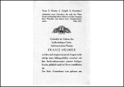 Eltern: Franz Anton Heimer u. Wilhelmine geb. Becker; Priesterweihe Köln 15.8.1893; Vikar in Ameln b. St. Vith, Korschenbroich und Wevelinghoven; 5.4.1903 Pfarrer in Evinghoven, dort 42 J.; am 5.9.1937 auf Pilgerfahrt nach Kevelaer verunglückt und konnte Seelsorgertätigkeit nicht mehr ausüben |