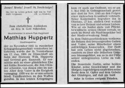 Opfer 2. Weltkrieg; Eltern: Wilhelm Huppertz u. Gertrud geb. Ramrath; ∞ Käthe Rosenbaum; 3 K., davon 1 früh †; 1.5.1945 Gefangenschaft; tückische Krankheit; Grab: Olschan b.Orel; Stadtinspektor in Neuss |