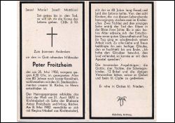 Eltern: Anton Froitzheim u. Margarete Köcher; ∞ 8.5.1902 Regina Mockel aus Kirchtroisdorf; 8 K., davon 2 früh †, 2 töchter u. 1. Sohn † in der Blüte ihrer Jahre; Druck in Bedburg/Erft |