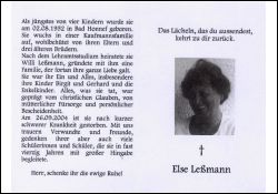 Stammte aus kaufmannsfamilie, Lehramtsstudium, ∞ Willi Leßmann; Kinder Birgit u. Gerhard; fast 40 J. im Schuldienst |