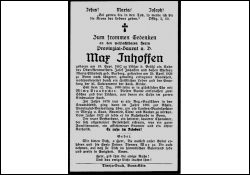 Eltern: Ober-Rentmeister Josef Inhoffen u. Maria Elisabeth geb. Burberg; ∞ 12.12.1889 Mimy Staudacher; 5 K., davon 1 früh †; Landes-Bauinspektor b. Rhein. Prov.-Verwalt. (Merzig, Neuwied, Cleve, Aachen) |