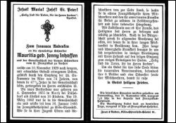 Schwester Mauritia, Genossenschaft d. Armen Schw. v. h. Franziskus zu Aachen; 19.3.1882 Eintritt in Gen.; seit 16.1.1895 im Franziskushospital Köln-Ehrenfeld; Sakristanin; lange, schmerzhafte Krankheit |