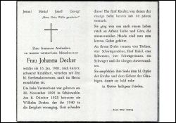 ∞ 8.10.1923 Wilhelm Decker, † 1940; 5 K., davon 1 Sohn mit 14 J. †; Druck in Bedburg/Erft |