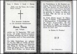 Eltern: Gottfried Vohsen u. Katharina geb. Tübee; ∞ 10.2.1912 Johann Thorn; 6 K., davon 1 †; langes Leiden; Wohnort: Epprath; Druck in Bedburg/Erft |