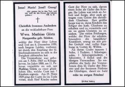 Langes Leiden; ∞ 11.2.1888 Mathias Görtz, † 25.3.1929; 7 K., davon 5 †, davon 1 Sohn im 1. Weltkrieg gefallen; Wohnort: Epprath |