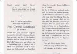 Längere Krankheit; ∞ 2.3.1935 Hans Muermann aus Hedwigsthal; 1 Tochter; mit Beginn des 2. Weltkrieges musste ihr Mann für immer die Familie verlassen; erst kurz vor ihrem Tod erfuhr sie, dass er bei Berlin gefallen ist; Wohnort: Epprath |