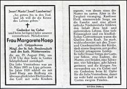 ∞ 1920 Josef Haep aus Bedburg/Erft; 6 K., davon 1 früh †; Mitgl. St. Sebastianus-Bruderschaft u. Kath. Mütterverein; Druck in Bedburg/Erft |