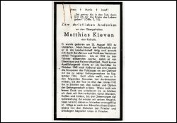Gefallener 2. Weltkrieg; in der Landwirtschaft tätig (in Kalrath); als Sanitäter Okt. 1942 nach Russland; Sept. 1944 Gefangennahme; |