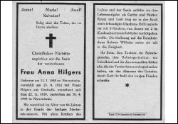 ∞ 27.8.1912 Franz Hilgers aus Grefrath, † 22.11.1939; 5 K., davon 2 früh †; Sohn Wilhelm im 2. Weltkrieg vermisst |