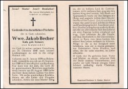 Wohnort: Katzwinkel; ∞ 25.9.1900 Jaob Becher aus Bomberg, † 20.8.1920; 6 K.; Druck in Betzdorf |